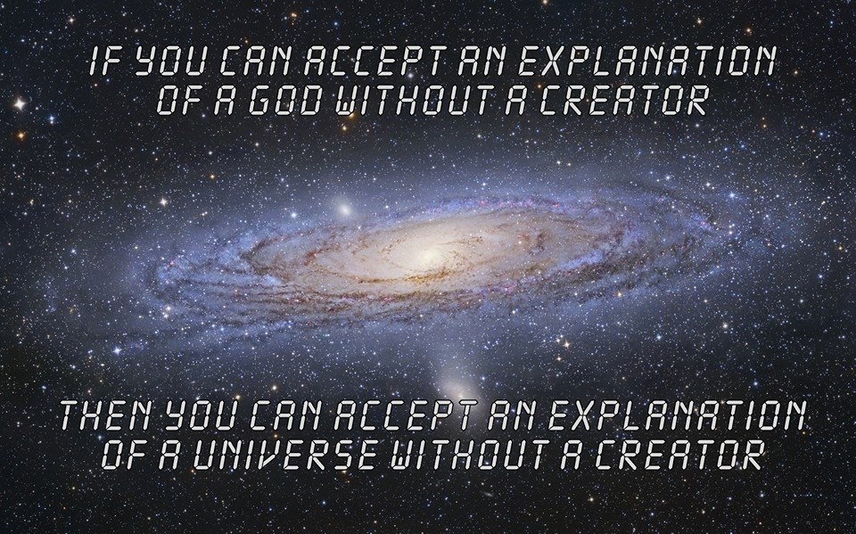 The knee jerk reaction I get from her, and from most of the research I have done into this argument, is “God doesn’t need a creator, he’s god”. What a useless explanation. Why would God possess some ability to be eternal (though once you think about something existing outside of existence all of this gets REALLY weak) yet another object (lets say the Universe, multiverse, tiny-verse, micros-verse whatever you like) not be able to possess that same characteristic?