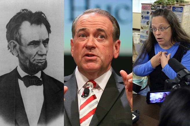 What I don’t understand is how any one that knows ANYTHING about law or civics could back up this lady’s behavior. So let’s assume for a moment that he was just swept up in a moment of Christian woe-is-me-ism. Fine, I get it. But then he goes a little more out on a limb… comparing this self-righteous bigot to Abraham Lincoln, and then quickly followed that with a comparison to Rosa Parks saying: “Immediately release Kim Davis from federal custody. Exercising Religious Liberty should never be a crime in America. This is a direct attack on our God-given, constitutional rights.”